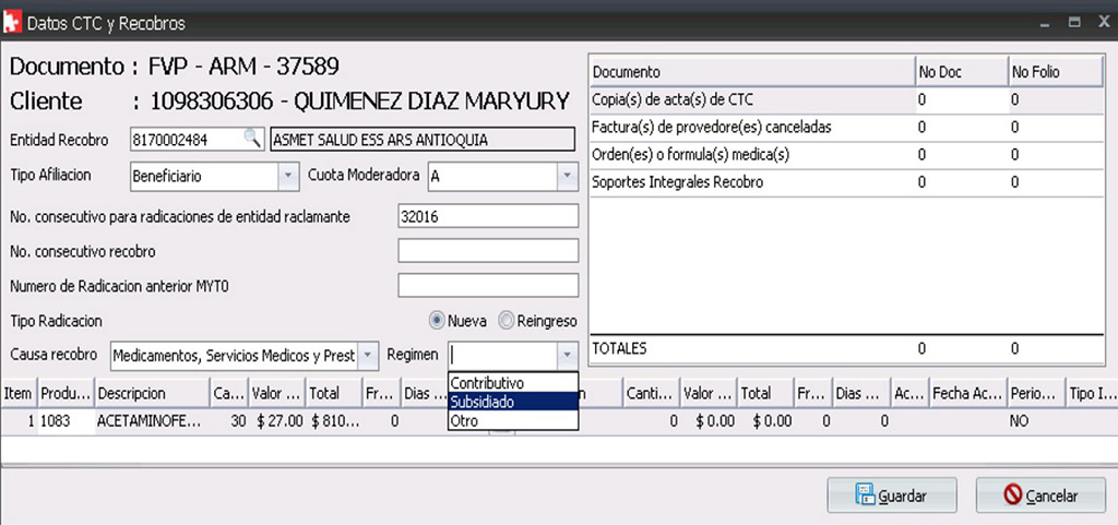 • Ingreso de la fórmula con registro del médico que expidió la misma, paciente y entidad a la que se realiza el cobro.